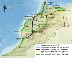 El operador ferroviario nacional ONCF está trabajando en varios proyectos. El proyecto más grande es un ferrocarril de alta velocidad desde Tánger a través de Rabat y Casablanca a Marrakech. Además, una conexión ferroviaria (de pasajeros) entre Tánger y Tánger MED, el puerto en el Mediterráneo cerca de Tánger, proporcionará a los pasajeros que lleguen en ferry una conexión con las líneas principales. Un tren operará cada 2 horas entre el puerto y la ciudad de Tánger. Una línea de carga desde la fábrica de Renault en Tánger MED ya está operativa[6] El ferrocarril de Marrakech a Agadir también está previsto que se complete en 2025,[7] convirtiéndose en la primera línea de ferrocarril en llegar a la región sureña de Sus-Masa.