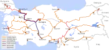 - Trans-Asia Express (Trans-Asya Ekspresi), Ruta: Estambul, estación de Haydarpaşa, Turquía - Eskişehir, Turquía - Ankara, Turquía - Kayseri, Turquía - Sivas, Turquía - Malatya, Turquía - Elazığ, Turquía - Muş, Turquía - Tatvan, Turquía - Tatvan, Turquía - Van, Turquía - Kapıköy, Tuquía - Razi, Irán - Tabriz, Irán - Teherán, Irán y viceversa.