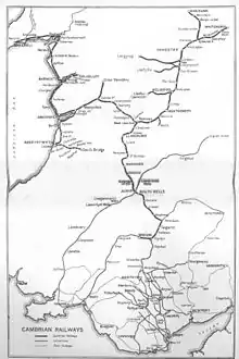 - Ferrocarril Mid-Wales 45+1/2 de milla (73 km): 1 de agosto de 1859; 1 de septiembre de 1864. Este ferrocarril fue independiente del de Cambria hasta el 1 de enero de 1888, cuando este último se hizo cargo de la línea. El 1 de julio de 1904 se fusionaron los dos ferrocarriles.