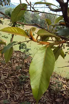 Las hojas son grandes de 10 - 20 cm de largo y 4 - 8 cm de ancho, tienen forma obovada o elíptica y terminan bruscamente en un ápice acuminado de menos de un cm de longitud, mientras que la base es redondeada o subcordada. Poseen entre 12 y 15 pares de nervios prominentes sobre todo en el envés. El peciolo mide entre 1 y 4.5 cm de largo.