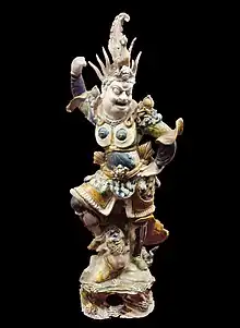 El lokapala también se encontró en el suelo en templos budistas, en piedra o madera.[63] Parecen representar una fusión de los guardianes taoístas tradicionales, que se remontan a la dinastía Han, y el dvarapala budista o «Reyes celestiales», de los cuales había en teoría cuatro, aunque a menudo únicamente dos fueron representados en otras culturas budistas. También se mostraron como «un semihumano de cresta fabulosa con ojos saltones, boca furiosamente abierta y brazos y piernas poderosos».[30] Mientras que las versiones indias enfatizaban los atributos reales, en China fueron «transformados en dinámicos generales idealizados»,[63] con una armadura elaborada, a menudo con relieves añadidos.