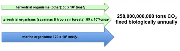 Se estima que la fotosíntesis convierte aproximadamente 258.000 millones de toneladas de dióxido de carbono cada año. La mayor parte de la fijación ocurre en los océanos, especialmente en las áreas ricas en nutrientes con abundancia de fitoplancton. La cantidad bruta de dióxido de carbono fijada es mucho mayor ya que aproximadamente el 40% del total fijado se consume en la respiración diariamente.[1] Se considera que la enzima fijadora de carbono RuBisCO es la proteína más abundante en la Tierra.