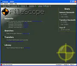 FileScope es un cliente multired para intercambio de archivos escrito por Matt Zyzik, y es compatible con las redes Gnutella, Gnutella2, EDonkey2000 y OpenNap.