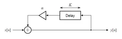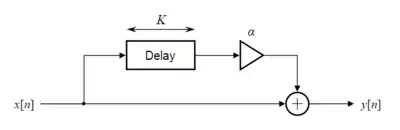 donde es el tamaño del retraso (medido en muestras), y es un factor de escalamiento aplicado a la señal retrasada. Si tomamos la transformada Z en ambos lados de la ecuación, obtenemos: