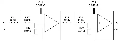 En la siguiente figura se observa un filtro formado por dos células de Sallen-Key en cascada. Esta es una práctica habitual para aumentar el orden de un filtro. También se usan amplificadores operacionales.