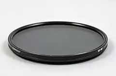 - Polarizador: Eliminan reflejos indeseados en agua, cristales y otras superficies (excepto en los metales, como los objetos cromados) y produce colores más saturados al seleccionar los rayos de luz que entran en el lente de cámara fotográfica.[1] El efecto puede cambiarse rotando una de las dos partes de que se compone el filtro y variando la orientación. Se percibe mejor en teleobjetivos u objetivos normales que en gran angulares. Los hay lineales o circulares: