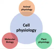 La fisiología celular se relaciona con diferentes campos de la fisiología, como la fisiología animal, la fisiología animal comparada, la fisiología vegetal y la biología molecular, son partes fundamentales del campo de la fisiología. La fisiología animal desempeña un papel en el trabajo de varios órganos del cuerpo que coordinan esos órganos para integrar el comportamiento animal. Los médicos en cuestión estaban preocupados por la fisiología de los organismos vertebrados en particular los mamíferos, porque la información proporcionada podría aplicarse de manera beneficiosa a la fisiología del ser humano en la salud y las enfermedades. Es beneficioso trabajar en la fisiología de los órganos como un enfoque médico. Sin embargo, el nivel celular también se puede utilizar. Además, la fisiología animal comparativa es un obstáculo para estudiar la función de cualquier órgano en varios tipos de animales, como vertebrados e invertebrados, para encontrar las relaciones fundamentales. La fisiología vegetal es más probable que se trate de la respuesta, nutrición, crecimiento y reproducción de diferentes tipos de plantas. y dado que el funcionamiento de animales y plantas dependen de la función del componente celular. Todos estos estudios fisiológicos han sido reconocidos por investigadores interesados en los organismos y que trabajaron a nivel celular para resolver problemas a nivel de los órganos. por otro lado, la biología molecular se vuelve para explicar las actividades de las células a nivel molecular. En el pasado, ha sido limitada al estudio de las actividades de los virus y las bacterias. Sin embargo, ahora se está extendiendo al estudio de las actividades de las células eucariotas. La biología molecular ha contribuido como un objetivo para la fisiología celular al ser una fuente poderosa de mutantes (este método se ha aplicado a muchos problemas en fisiología celular), como el transporte a través de la membrana celular y la naturaleza de las membranas. Sin embargo, muchos de los problemas de fisiología celular no se han resuelto mediante el enfoque molecular.
