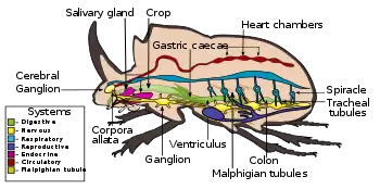 El sistema digestivo de los insectos consiste de un largo tubo que recorre el cuerpo de un extremo a otro. Permite la entrada de alimentos por la boca, procesa ese alimento y elimina los restos por el ano. El tubo digestivo tiene secciones específicas para triturar, almacenar y absorber el alimento. Hay secciones que segregan enzimas que modifican las moléculas y que ayudan a la absorción de nutrientes. Hay esfínteres que regulan el paso del alimento y los líquidos de una región a otra.[1][6]