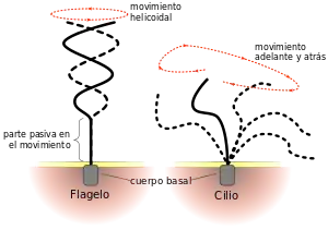 Junto con los cilios, los flagelos eucariotas constituyen un grupo de estructuras conocidas como undulipodios. Su ultraestructura es esencialmente la misma, pero el flagelo generalmente se complica con otros elementos añadidos, resultando más grueso y más largo.[5] Otra diferencia es el patrón de batido (véase más abajo).