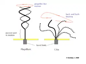 Aunque flagelos y cilios eucariotas son idénticos en ultraestructura, estos dos tipos de apéndices tienen patrones de batido diferentes. Los flagelos, que impulsan a los espermatozoides y a muchos protistas, están diseñados para que uno sólo de ellos (o unos pocos) pueda impulsar a la célula completa a través de un fluido. El batido del flagelo genera un movimiento helicoidal sin que el eje rote sobre sí mismo, como ocurre en el giro de una honda. En contraste, los cilios están diseñados para actuar coordinadamente con otros muchos sobre la superficie celular. Su batido consiste en movimientos cíclicos, primero hacia atrás (propulsado rígido) y luego hacia adelante (recuperación flexible), como ocurre en el batido de un remo.