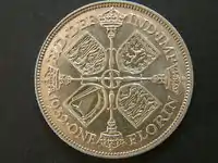 Los florines que llevan la efigie de Jorge V orientada hacia la izquierda, realizada por sir Bertram Mackennal, se acuñaron en cada año del reinado (1910-1936), a excepción de 1910 y 1934.[7] El diseño del reverso inicial (1911-1926) se desarrolló de forma interna en la Real Casa de Moneda, y estaba destinado a ser el diseño del doble florín de 1887, el cual es muy similar al «florín del jubileo».[28] El peso y el diámetro de la moneda no cambiaron, pero, debido a los aumentos en el precio de la plata, la composición metálica se cambió en 1920 de 0,925 de plata a 50% de plata, 40% de cobre, 10% de níquel; en 1922 a 50% plata, 50% de cobre; y en 1927 a 50% de plata, 40% de cobre, 5% de níquel y 5% de zinc.[29] Los cambios en la aleación después de 1920 se debieron a que la Casa de la Moneda intentó encontrar una aleación plateada que fuera atractiva.[30] Las inscripciones en el anverso de la versión original del florín de Jorge V muestran georgivs v d g britt omn rex f d ind imp[lower-alpha 7] y en el reverso one florin (un florín) y el año de acuñación.[29]