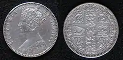 Esta primera acuñación causó un gran impacto, ya que por primera vez en casi 200 años una moneda británica presentaba un retrato del monarca con una corona, además de que la inscripción en el anverso victoria regina 1849[lower-alpha 2] omitía la habitual d g de Dei gratia (por la gracia de Dios) de la inscripción de la moneda,[4] lo que llevó a que se le conociera como el «florín sin Dios». La omisión de la abreviatura f d de Fidei defensor (Defensora de la fe) generó aún una mayor controversia. Algunos sospechaban que el maestro de ceca, Richard Lalor Sheil, irlandés y católico, conspiraba para derrocar al régimen protestante, pero, de hecho, la inscripción había sido sugerida por el príncipe Alberto, esposo de la reina Victoria. Sheil declaró en la Cámara de los Comunes que la inscripción había sido un error, y el florín se rediseñó para su próxima edición en 1851.[12]