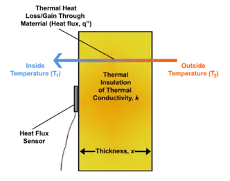 Diagrama que representa el flujo de calor a través de un material de aislamiento térmico con conductividad térmica, k y espesor, x. El flujo de calor se puede determinar utilizando dos mediciones de temperatura de superficie en cada lado del material usando sensores de temperatura si también se conocen k y x del material.