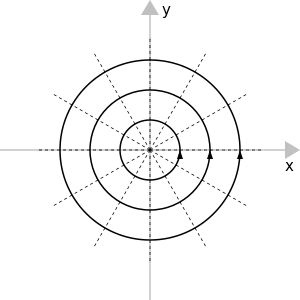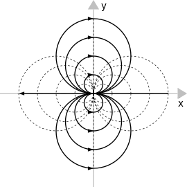 Las fuentes lineales y los sumideros lineales (abajo) son flujos elementales importantes porque desempeñan el papel de monopolo(s) para fluidos incompresibles (que también pueden considerarse ejemplos de campos solenoidales es decir, campos libres de divergencia). Los patrones de flujo genéricos también pueden descomponerse en términos de expansión multipolar, del mismo modo que para los campos eléctrico y magnético, donde el monopolo es esencialmente el primer término no trivial (por ejemplo, constante) de la expansión.
