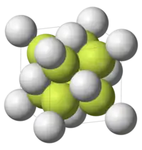 Es por esta razón por la que se prefiere describir la estructura cristalina como una red cúbica simple de iones flúor,[16] entre las posiciones alternas de coordinación cúbica se encuentran los iones Ca++.