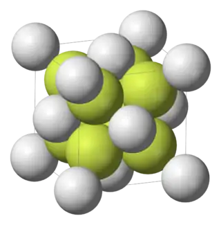 El fluoruro de calcio es un compuesto inorgánico de fórmula química CaF2. Este compuesto iónico de calcio y flúor se encuentra en la naturaleza como el mineral fluorita. Es la fuente de flúor más empleada en el mundo. Este sólido insoluble adopta una estructura cúbica en la que el calcio se coordina con ocho aniones fluoruro y cada ion F- está rodeado por cuatro cationes Ca2+.[4] Aunque el material puro es incoloro, el mineral está a menudo profundamente coloreado debido a la presencia de electrones capturados, centros de color o centros F (del alemán Farbenzenter).[5]