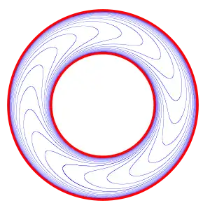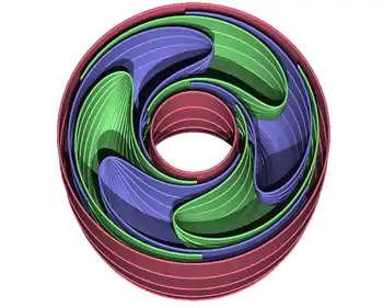 ![]() Modelo tridimensional de la mitad de uno de los toros de la foliación de Reeb |