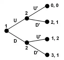 El nodo inicial pertenece al jugador 1, lo que indica que el jugador 1 mueve primero. El juego según el árbol es el siguiente: El jugador 1 elige entre U y D; el jugador 2 observa la elección del jugador 1 y luego elige entre U 'y D'. Los beneficios son los especificados en el árbol. Hay cuatro resultados representados por los cuatro nodos terminales del árbol: (U, U '), (U, D'), (D, U ') y (D, D'). Los pagos asociados con cada resultado, respectivamente, son como sigue (0,0), (2,1), (1,2) y (3,1).