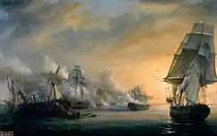 ![]() El Formidable se enfrenta a tres barcos ingleses en la batalla de Algeciras. "Hermosa hazaña de armas del capitán Troude" lienzo de Antoine Léon Morel-Fatio | ||