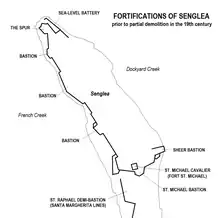 - St. Michael Cavalier: un caballero que originalmente era el Fuerte San Miguel . Fue demolido en 1921, pero se ha conservado una pequeña parte de su base.[12]