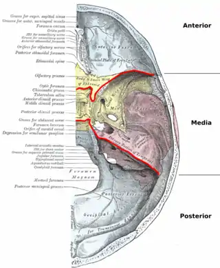 ![]() Base del cráneo. Superficie superior. (La fosa craneal media es la más central de las tres hendiduras, en rosa y amarillo) | ||