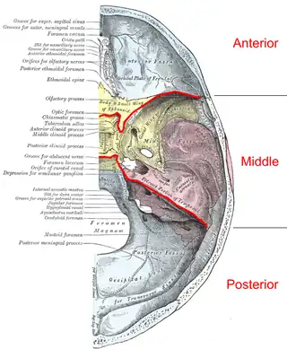 ![]() Base del cráneo. Superficie superior. La fosa craneal posterior está coloreada en azul, amarillo y rojo. | ||