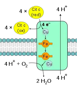 Esta enzima media la reacción final en la cadena de transporte de electrones y los transfiere al oxígeno, mientras bombea protones a través de la membrana.[74] El aceptor de electrones final es el oxígeno, llamado también aceptor terminal de electrones, el cual es reducido a agua en este paso. Tanto el bombeo directo de protones y la consumición de protones de la matriz en la reducción de oxígeno contribuyen al gradiente de protones. La reacción catalizada es la oxidación de citocromo c y la reducción de oxígeno: