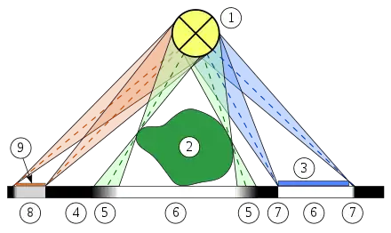 Creación de un fotograma: Una fuente de luz (1) ilumina el objeto (2 y 3) que está colocado directamente sobre una superficie fotosensible. Dependiendo de la distancia de los objetos a la película, su sombra es más nítida (7) o más difusa (5). Las zonas de la película que se hallan en la sombra (6) proporcionan un color blanco, la traza de los objetos con partes transparentes o translúcidas se convierte en gris y las zonas que están plenamente expuestas (4) se ennegrecen.