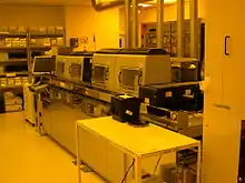Una oblea se introduce en un sistema automatizado de seguimiento ("wafertrack"). Este tramo automatizado consiste en un conjunto de robots que manipulan el proceso de forma autónoma, de horno/enfriamiento, así como los procesos de recubrimiento/desarrollo de las unidades. Los robots se emplean para transferir las obleas de un módulo a otro. Las obleas se calentaban inicialmente en un horno a una temperatura suficiente elevada como para eliminar la humedad de la superficie de la oblea. Se añade a la atmósfera hexa-metil-disilizano (HMDS) con el objeto de facilitar la adhesión de la fotoresina, que es un material polimérico denominado fotoresistor. Cuando se añade la fotoresina se gira la placa para que se distribuya homogéneamente. La velocidad y aceleración de los movimientos de manipulación de la oblea son parámetros importantes de esta fase, ya que son los responsables del grosor y uniformidad de la fotoresina. Las obleas recubiertas se introducen en un horno para que sean tratadas con temperaturas no muy altas.