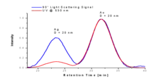 La FFF centrífuga tiene la ventaja de que las partículas y las macromoléculas se pueden separar por densidad de partículas, en lugar de solo por el tamaño de las partículas. En este caso, dos nanopartículas de oro y plata de tamaño idéntico se pueden separar en dos picos, según las diferencias de densidad en las nanopartículas de oro y plata, separadas con el instrumento Centrifugal FFF Postnova CF2000 con detección por dispersión dinámica de la luz (DLS).