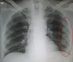 ![]() Radiografía de tórax en la que son visibles varias fracturas costales señaladas por un óvalo en el hemitórax izquierdo. | ||