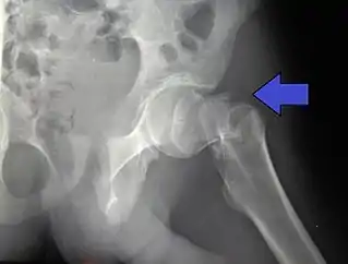 Una fractura proximal de fémur es un tipo de fractura de cadera que se produce en la parte superior del fémur (hueso del muslo).[1] Los síntomas pueden incluir dolor alrededor de la cadera, particularmente con el movimiento, y encogimiento de la pierna.[1] Por lo general, la persona no puede caminar.[3]