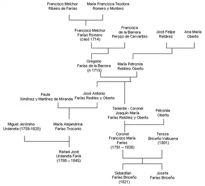 El apellido Farías llegó a Los Puertos de Altagracia por Francisco Melchor Farías, hijo de Francisco Melchor González de Farías y Francisca Teodora Romero y Montero, quien vino de Portugal y se casó en 1714 con Francisca Romero en Maracaibo. En 1715 fueron padres de Gregorio Farías y Romero, quien fue comerciante el Los Puertos de Altagracia y padre del Teniente Coronel Joaquín María Farías y de José Antonio Farías, este último padre de María Alejandrina Farías, madre de Rafael José Urdaneta Farías.