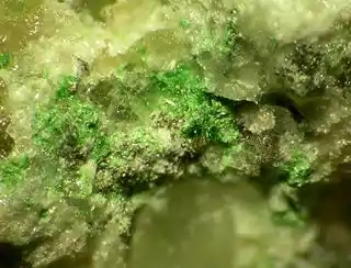 Es un mineral de coloración verde clara y brillo adamantino. Tiene dureza 3 - 4 en la escala de Mohs, comparable a la de la calcita y la fluorita. Cristaliza en el sistema ortorrómbico.