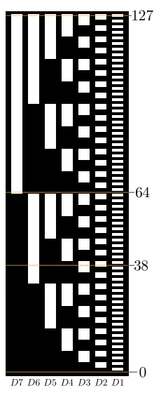 Cubierta de Código Binario Natural, con ciertos valores marcados. Los valores más bajos están en la parte inferior. Esta imagen es una versión vectorizada de la que se encuentra en la página 2 (Fig. 2) de la solicitud de patente original de Frank Gray, numerada 2632058.