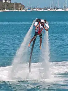 El diseño del Flyboard consiste en una tabla bajo los pies que cuenta con dos potentes chorros que proporcionan un empuje que permite al usuario elevarse en el aire o sumergirse de cabeza al agua.[13] La tabla va conectada a la toma de agua de la moto acuática y utiliza la fuerza generada por la moto para propulsar a la persona.[11]