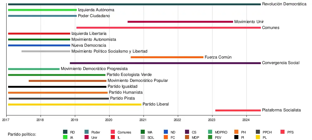 Partido Humanista (PH): Partido fundador de la coalición que logró elegir a tres diputados en las elecciones parlamentarias de 2017. Abandonó la coalición el 12 de diciembre de 2019.[53]