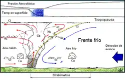El frente frío es una franja de inestabilidad que ocurre cuando una masa de aire frío se acerca a una masa de aire caliente. El aire frío, siendo más denso, genera una "cuña" y se mete por debajo del aire cálido y menos denso.