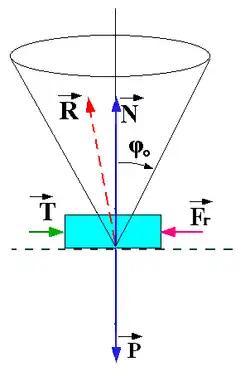 La fuerza de fricción es la fuerza que existe entre dos superficies en contacto, que se opone al deslizamiento (fuerza de fricción estática y cinética). Se genera debido a las imperfecciones, que en mayor parte son microscópicas, entre las superficies en contacto,[cita requerida] aunque también existen fenómenos de interacción electrostática entre superficies. Estas imperfecciones hacen que la fuerza perpendicular R entre ambas superficies no lo sea perfectamente, sino que forme un ángulo con la normal N (el ángulo de rozamiento). Por tanto, la fuerza resultante se compone de la fuerza normal N (perpendicular a las superficies en contacto) y de la fuerza de rozamiento F, paralela a las superficies en contacto.