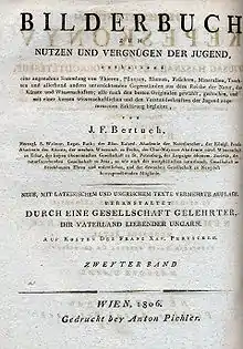- Bilderbuch für Kinder enthaltend eine angenehme Sammlung von Thieren, Pflanzen, Blumen, Früchten, Mineralien, Trachten und allerhand andern unterrichtenden Gegenständen aus dem Reiche der Natur, der Künste und Wissenschaften; alle nach den besten Originalen gewählt, gestochen, und mit einer kurzen wissenschaftlichen, und den Verstandes-Kräften eines Kindes angemessenen Erklärung begleitet von F. J. Bertuch. 12 Bände. Verlag des Industrie-Comptoirs, Weimar 1792-1830 (online [UB Heidelberg]).