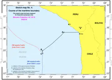 El segundo se inicia en el punto en que el paralelo geográfico que pasa por el Hito N.º 1 se interseca con la línea de baja marea, y a partir de allí se prolonga hasta las 80 millas náuticas, luego continúa en dirección sudoeste sobre una línea equidistante desde las costas de ambos países hasta su intersección con el límite de las 200 millas náuticas medidas desde las líneas de base de Chile y, posteriormente, continúa hacia el sur hasta el punto de intersección con el límite de las 200 millas náuticas medidas desde las líneas de base de ambos países.