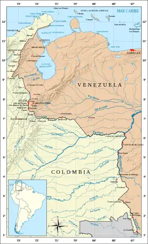 ![]() Ubicación de Venezuela (azul) y Colombia (verde).