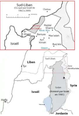 Israel también se anexó los Altos del Golán en 1981 después de su conquista en la guerra de los Seis Días en 1967. Las granjas de Shebaa, ubicadas en los altos del Golán, han sido reclamadas por el Líbano desde el año 2000 de acuerdo con Siria.[6]