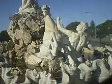 El monumento, de filiación renacentista y formas y texturas de estilo barroco, representa el nacimiento de Venus. Se halla realizado en mármol blanco y su base representa una gran valva de molusco rodeada de tres grupos formados cada uno de ellos por un magnífico corcel sumergido en el agua de la valva. Cada animal es sostenido por la brida por un atlético varón desnudo (lamentablemente en un acto vandálico las bridas fueron rotas y reemplazadas por sogas). Estos varones son los tritones, servidores del cortejo de Poseidón. Sobre la valva se levanta un pilar de roca rústica (travertino de Tívoli) sobre la que se arrodillan dos nereidas desnudas (o sirenas) que sostienen una valva pequeña. Sobre ésta se encuentra sentada la Diosa Venus (quien se dice nació de la fecundación de la espuma de mar) representada por otro desnudo femenino. El espejo de agua de la fuente que rodea el conjunto refleja todo el motivo.