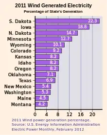 El viento genera aproximadamente el 16% (EWEA - 2011 European Statistics, febrero de 2012) de la energía eléctrica en España y Portugal,[36] 9% en Irlanda,[36] y 7% en Alemania.[37] Wind proporciona alrededor del 40% de la electricidad anual generada en Dinamarca[38] (un 20% más que en 2005);[39][40] para alcanzar este porcentaje, Dinamarca exporta excedentes e importaciones durante fallas hacia y desde la red de la UE, particularmente Norwegian Hydro, para equilibrar la oferta con la demanda.[41]