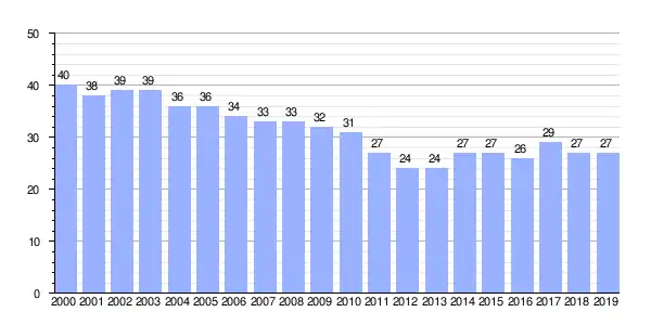 | Gráfica de evolución demográfica de Fuentes-Rosas entre 2000 y 2019 |