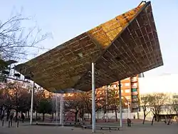 Para la Exposición se realizó también la Dama del paraguas (1884), de Joan Roig i Solé, situada en el actual emplazamiento del Zoo, y que con el tiempo se ha convertido en una obra emblemática de la ciudad.[53] La fuente está formada por dos tazas superpuestas sobre una base de rocalla situada en un estanque circular, y coronada por la figura que le da nombre, una joven vestida con un traje de la época, de pie con un paraguas en la mano izquierda, mientras que asoma la derecha en actitud de comprobar si aún llueve. Se trata por tanto de un instante congelado en el tiempo, lo que otorga cierto dinamismo a la figura, alejado de los rigurosos cánones de las representaciones oficiales de la época. Asimismo, el hecho de que el agua caiga desde arriba del paraguas gracias a una canalización interior, confiere vida al conjunto, dando una apariencia de verosimilitud a la escena.[54]