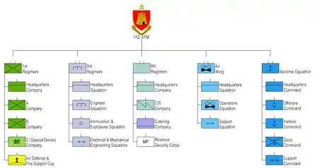 Además de las fuerzas regulares, también existe una Fuerza de Emergencia de Reservistas Voluntarios, que consiste de voluntarios a tiempo parcial en apoyo de los regulares en la Compañía de Apoyo & Defensa Aérea (1º Regimiento).