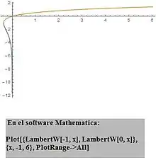 Puesto que la función f no es inyectiva, la función W es multivaluada (excepto en 0). De restringir los argumentos reales, x y w reales, la función es definida solo por x ≥ −1/e, y es doble-valuada en (−1/e, 0); la restricción adicional w ≥ −1 define una función simple-valuada W0(x), representable gráficamente. Tenemos W0(0) = 0 y W0(−1/e) = −1. La rama alternativa en [−1/e, 0) con w ≤ −1 es indicada como W−1(x) y decrece de W−1(−1/e) = −1 a W−1(0−) = −∞.