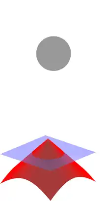 - Para superficies que no encierran un volumen es posible también determinar el signo de . Sabemos que la elección de un vector normal en un punto p de una superficie S induce una orientación en S, esto es, un campo continuo de vectores normales a la superficie. Para superficies no orientables en general es posible, de la misma manera, determinar una orientación local en un entorno de p. Luego, como en general puede tomarse como la distancia entre x y un único punto , y como es paralelo a la función tomara un valor positivo si tiene el mismo sentido que y un valo negativo si tienen sentidos opuestos.